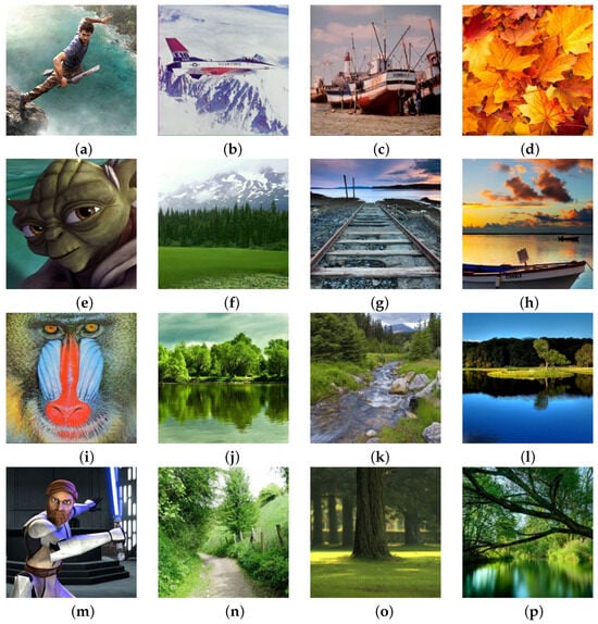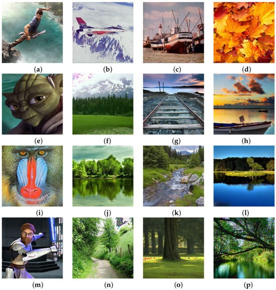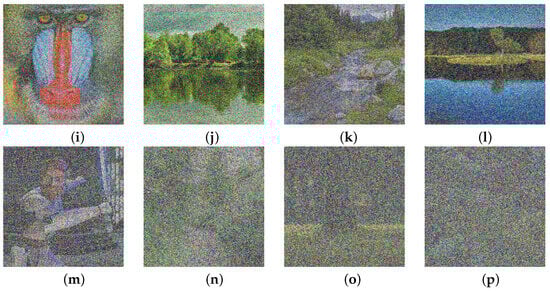 Digital image samples with added nS&P noise: (a) 1%, (b) 2%, (c) 3%, (d) 4%, (e) 5%, (f) 7.5%, (g) 10%, (h) 10%, (i) 30%, (j) 40%, (k) 50%, (l) 50%, (m) 70%, (n) 80%, (o) 80%, (p) 90%.