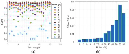 (a) Values of the SSIM parameter for reconstructed images with increasing noise spatial density, (b) values of the standard deviation of the SSIM parameter.