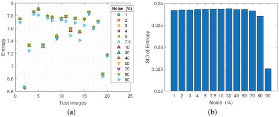 (a) Values of the entropy parameter for reconstructed images with increasing noise spatial density, (b) values of the standard deviation of the entropy.