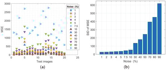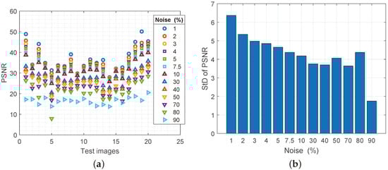 (a) Values of the PSNR parameter for reconstructed images with increasing noise spatial density, (b) values of the standard deviation of the MSE parameter.
