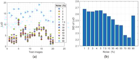 (a) Values of the LoD parameter for reconstructed images with increasing noise spatial density, (b) values of the standard deviation of the LoD parameter.