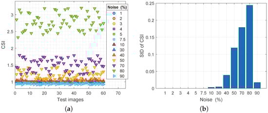 (a) Values of the CSI parameter for reconstructed images with increasing noise spatial density, (b) values of the standard deviation of the CSI parameter.