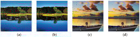 Specifically, Figure 10a,c depict the outcome of the initial treatment by the Regeneration filter, following the addition of 90% noise spatial densities to images from Figure 1l,h. Conversely, Figure 10b,d show case the results after the second interaction with the Regeneration filter. It is evident from Figure 10b,d that there is no loss of image quality after the repeated use of the filter, and the results indicate further noise reduction.