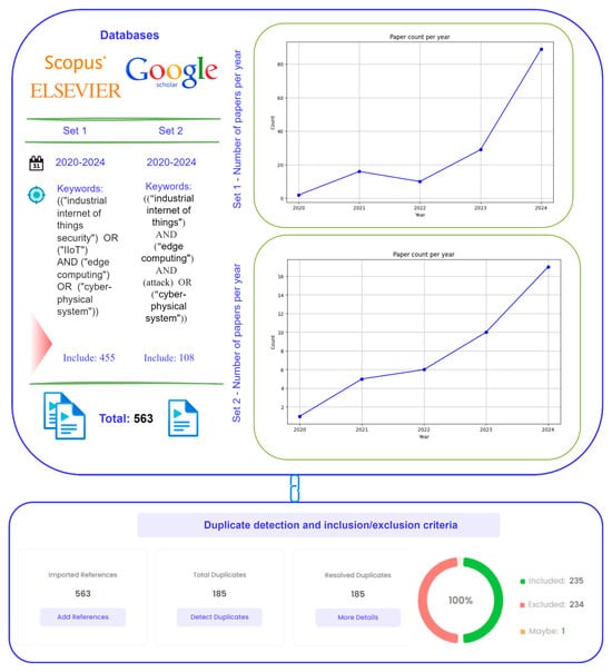 Figure 2 illustrates that, in accordance with the previously referenced data, a meticulous curation of pertinent publications was performed, with a focus on domains such as IIoT security, edge computing, and cyber-physical systems. Redundant entries were detected and systematically removed, resulting in a conclusive assembly of 235 distinct and pertinent articles for subsequent examination. Following a thorough review of the full text of all included articles, 185 were retained. The graphs highlight the rise in the number of publications for each set of keywords, reflecting the significance and growing interest in the topics studied in recent years.