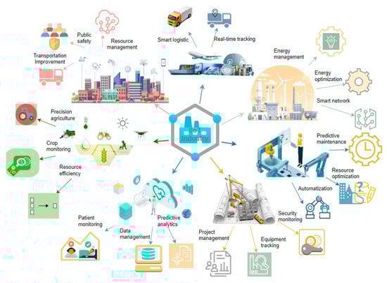 The IIoT is integral to smart production, facilitating automation, resource efficiency, and predictive maintenance. The integration of IoT with production processes facilitates real-time monitoring and control, resulting in enhanced productivity and diminished downtime [,].