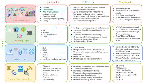 The IIoT is vulnerable to multiple types of attacks that can profoundly affect industrial processes. Attacks may manifest at several tiers of the IIoT architecture, encompassing the perception, network, and application layers, each possessing distinct vulnerabilities and repercussions. Methods for prevention and mitigation are also summarized in Table 2.