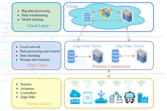 Security is a crucial element of CPS and IIoT integration, prompting the creation of edge computing-based authentication mechanisms to safeguard against unwanted access. CPS in the IIoT have considerable security issues, as internet-connected devices are susceptible to several threats, including device tampering, DDoS assaults, malware, hacking, and other cyberattacks. These assaults can impede essential industrial operations, resulting in production halts. This requires the adoption of protective measures, such as machine learning models for anomaly detection, attack mitigation, and risk management []. To resolve these challenges and guarantee efficient operations, edge computing technology has been progressively evolving, processing data at the network’s periphery, thereby diminishing latency and alleviating cloud burden.