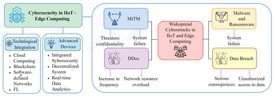 Edge computing enhances IIoT by redistributing data processing to the network’s perimeter, reducing the load on cloud resources and improving cybersecurity. This enables real-time data processing and danger detection, which is especially vital in resource-constrained environments. Edge computing reduces latency, conserves bandwidth, and accelerates responses to cyber threats, making it highly beneficial in industrial settings. Local data processing alleviates bottlenecks in wireless networks and improves the reliability of IIoT systems []. Artificial intelligence technologies, including deep learning (DL) and machine learning (ML), are critical elements of the IIoT (IIoT) and enhance efficiency by overseeing and regulating industrial machinery []. Artificial intelligence and deep learning at the edge facilitate collaborative model training among devices while ensuring data privacy. This is accomplished through technologies like federated edge learning, which enhances computing efficiency and minimizes latency []. Edge computing integrates with IoT, 5G, and AI technologies, enhancing sophisticated applications such as driverless vehicles and augmented reality. The principal advantages comprise diminished latency, improved bandwidth utilization, heightened data privacy and security, and energy efficiency [,]. Notwithstanding their benefits, the extensive deployment of edge devices renders them progressively susceptible to cyber threats, hence mandating an emphasis on cybersecurity [].