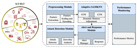 - Development of an Adaptive Online k-Nearest Neighbors (kNN) with Self Adjusting Memory (SAM) Classifier: Introduces the proposed classifier, an enhanced version of the SAMKNN classifier tailored for online learning scenarios. Our proposed adaptive SAMKNN dynamically adjusts its memory allocation between short-term memory (STM) and long-term memory (LTM) based on real-time performance metrics, enabling it to effectively handle evolving data distributions inherent in IoT and IIoT environments.