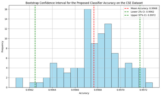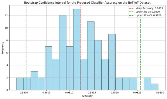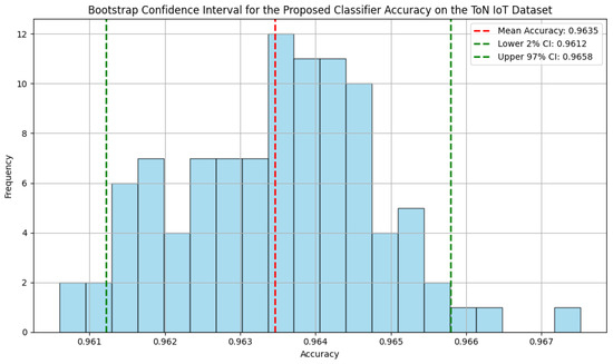 The bootstrap confidence intervals for the proposed classifier demonstrate high accuracy across the three datasets, as shown in Figure 5, Figure 6 and Figure 7, with narrow ranges indicating consistent performance. For the NF-BoT-IoT dataset, the classifier achieves a mean accuracy of 0.9813, with a 95% confidence interval between 0.9800 and 0.9826. Similarly, on the NF-ToN-IoT dataset, the mean accuracy is 0.9635, with a 95% confidence interval of 0.9612 to 0.9658. The NF-CSE-2018 dataset shows the highest accuracy, with a mean of 0.9968 and a 95% confidence interval from 0.9962 to 0.9972.