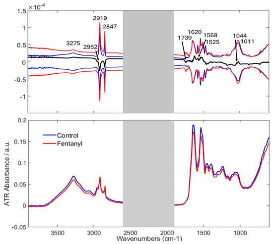 Top: Difference spectrum of “Control” and “Fentanyl” mean spectra, highlighting small differences between the groups. The standard deviation (SD) spectra for each group are also shown to highlight the variability in the spectral data. The SD spectra for the “Control” group (shown as a blue line) and the “Fentanyl” group (shown as a red line) are plotted in both positive and negative directions around the difference spectra. This visual representation offers a clearer understanding of the range of spectral variability in each group and helps to clarify the extent of the differences observed between the two classes. Bottom: Raw mean spectra of “Control” and “Fentanyl” groups.
