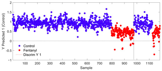 PLS-DA model results for all training and test spectra using 8 LVs. All spectra above the discrimination threshold are predicted as “Control”, while those below the threshold are predicted as “Fentanyl”. Blue data points represent spectra from samples which contained no fentanyl, while red data points represent spectra from samples which were known to contain fentanyl.