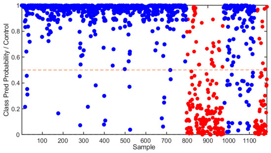 During cross-validation, the sensitivity for the control class decreased slightly to 94.7%, and the specificity decreased to 77.8%. The accuracy in this phase was 91.6%, indicating the model’s continued reliability when validated on various subsets of data. The model sensitivity during external validation was 81.3% for the control class, while the specificity was 81.7%. During this stage, the overall accuracy was 81.4%, hence showing a small drop in performance during calibration and cross-validation. This means that, while the model still predicts the most probable class for each spectrum fairly well, there are challenges in consistently achieving high accuracy. The results of the SVM-DA model are shown in Figure 3. At the donor level, the SVM-DA model achieved 100% accuracy in distinguishing between the two groups.