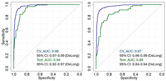On the contrary, the AUC for the SVM-DA model’s cross-validation (Figure 4, right) was 0.97, with a 95% CI between 0.96 and 0.99. This is slightly lower than the PLS-DA model’s AUC but still shows high performance. The SVM-DA model has an AUC of 0.89, with a 95% CI of 0.84 to 0.94 for the external validation set, which is lower compared to the PLS-DA model. The SVM-DA model, though still having excellent performance in the training data, shows reduced performance during external validation data compared to the PLS-DA.