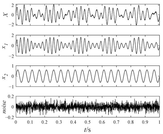 The noisy simulation signal shown in Equation (12) contains an AM–FM signal, a sinusoidal signal, and a Gaussian white noise with a noise amplitude of 0.1. The time-domain waveforms of the noisy simulation signal are displayed in Figure 1.