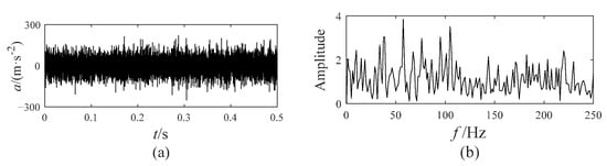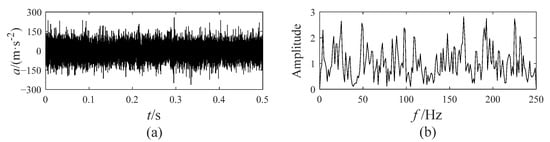 The vibration signal of the bevel gear with a crack fault is collected by the acceleration sensor. Its time-domain waveform and envelope spectrum are displayed in Figure 4.