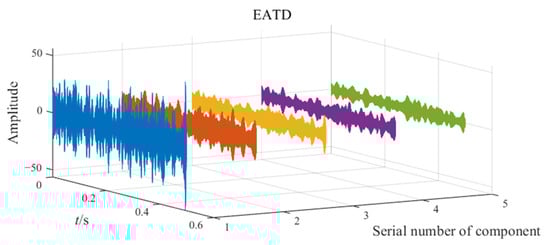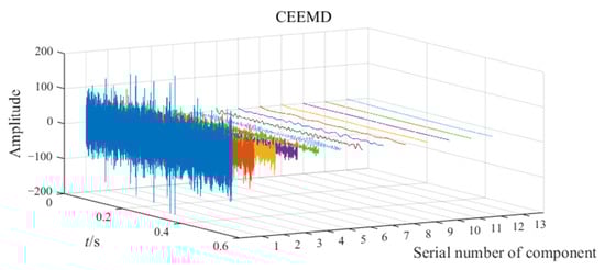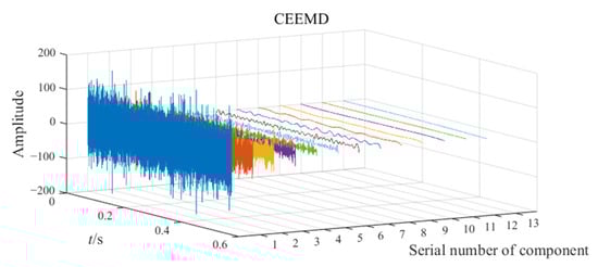 In view of the difficulty in accurately locating the fault frequency in the envelope spectrum of the gear fault signal, it is essential to decompose the gear fault signal through a signal decomposition method. Therefore, the gear fault signal is decomposed using the three methods: CEEMD, VMD, and EATD, and the results are sequentially displayed in Figure 10, Figure 11 and Figure 12. The ensemble number and the noise coefficient for CEEMD and EATD are set to 200 and 0.2, respectively. The optimal parameters for VMD are set as follows: alpha = 3000, and K = 4.