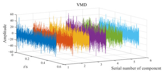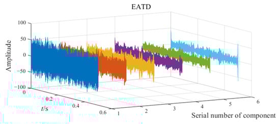 In Figure 4b, a large amount of noise frequencies interfere with the diagnosis of the gear fault, but a signal decomposition method can achieve the extraction of components that contain the fault frequency from the fault signal. Besides utilizing EATD to decompose the fault signals, CEEMD and VMD are also utilized to compare with EATD. This comparison allows for an evaluation of the strengths and weaknesses of the three methods in terms of extracting fault features. The decomposition results of CEEMD, VMD, and EATD are sequentially displayed in Figure 5, Figure 6 and Figure 7. The ensemble number and the noise coefficient for CEEMD and EATD are set to 200 and 0.2, respectively. The optimal parameters for VMD are set as follows: alpha = 5000, and K = 6.