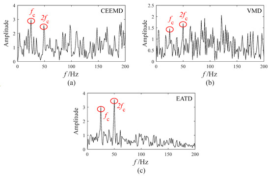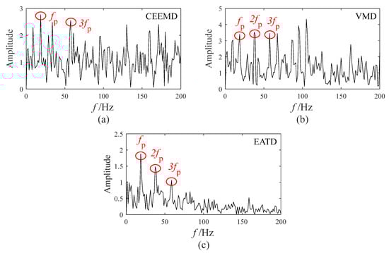 Figure 13 displays the optimal envelope spectrum of CEEMD, VMD, and EATD. In the optimal envelope spectrums of the three methods, the fault feature frequency and its multiples appear. However, there are many noise frequencies with high amplitudes surrounding the fault feature frequency and its multiples in the optimal envelope spectrums of CEEMD and VMD, which add interference factors to identify the fault feature frequency. As a result, CEEMD and VMD cannot overcome the mode mixing present in the gear vibration signals and fail to extract gear fault features. In the optimal envelope spectrum of EATD, there is almost no interference from noise frequencies, and the fault feature frequency and its multiples can be pinpointed.