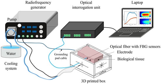 The RFA experimental setup comprises a custom-made box, an RFA system (Dophi™ R150E system (Surgnova, Beijing, China)) including a generator, electrodes, a cooling circuit, grounding pads, optical fibers equipped with fiber Bragg grating (FBG) sensors, an optical interrogator, and a computer for real-time temperature monitoring throughout the ablation process (Figure 1). The box was fabricated using a 3D printer, constructed from ABS material, and equipped with holes in the walls to allow the correct alignment of electrodes and sensors.