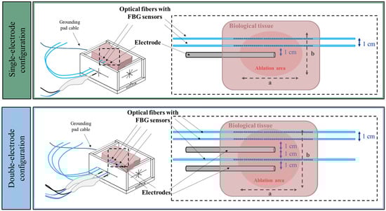 The optical fibers housing the FBGs were inserted in the organs with the help of a hollow needle, which was pulled out of the box before each RFA experiment, leaving the fiber in place. This operation was repeated for each required optical fiber: twice for the single-electrode setup since two arrays of FBG sensors were used, and three times for the double-electrode configuration since three arrays of FBG sensors were employed for thermometry within the tissue sample (Figure 2).