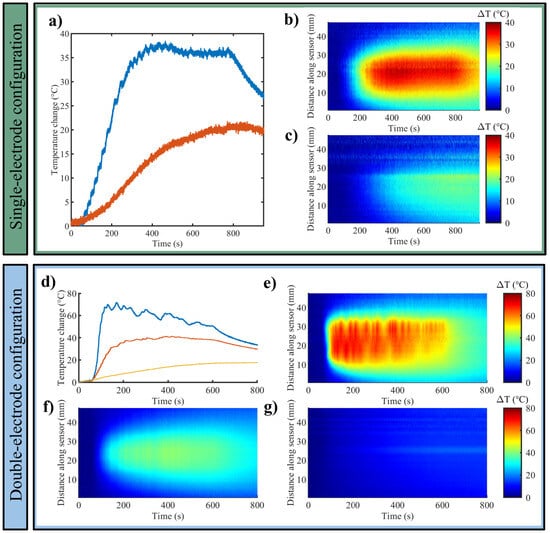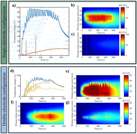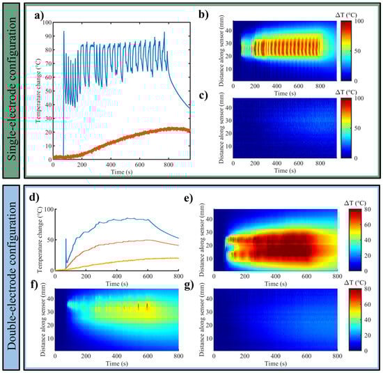 In Figure 3b,c,e–g, the graphs, having on the x-axis the time (s) and on the y-axis the distance along the sensor (mm), depict the 2D thermal distribution for the different cases. It is observable that especially the sensors placed at a 1 cm distance from the electrode have registered temperature spikes that likely reflect the variation of the power emitted by the RF generator to counteract the high impedance of the sample undergoing RFA.
