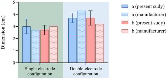 Bovine liver: ablation axes obtained from ex vivo experiments compared with the manufacturer’s data at different settings (i.e., 200 W for 12 min in the case of single-electrode configuration and 200 W for 9 min for the double-electrode configuration).