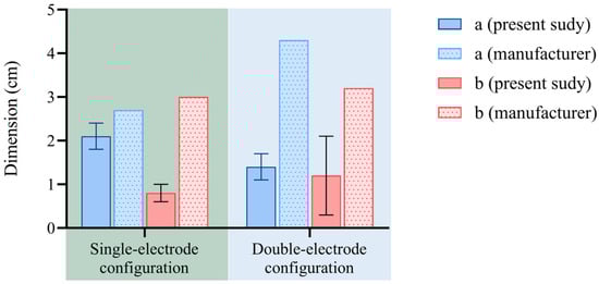 The mean values of ‘a’ and ‘b’ are overall consistent with the data provided by the manufacturer. Regarding the standard deviation, in the single-electrode setup (i.e., with a power of 200 W and a duration of 12 min), its value is 0.3 mm for ‘a’ and 0.2 mm for ’b’; for the double-electrode configuration and, therefore with a power of 200 W and a duration of 9 min, the standard deviation is 0.2 mm for ‘a’ and 0.3 mm for ‘b’. The sphericity index close to 1 in both electrode configurations indicates that a spherical ablation has been achieved. The ablation size per power unit is 1.43 and 1.85 for the single-electrode setup and the double-electrode setup, respectively.