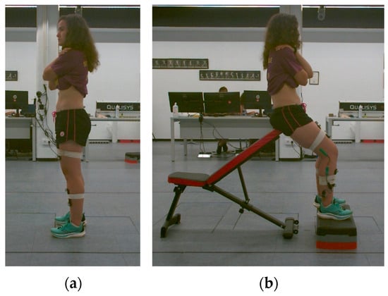 Starting positions for measurement of sagittal pelvic ROM: (a) initial position for left-side standing posture; (b) initial position for right-side sitting posture with 45° of hip flexion.