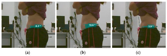Kinovea® sagittal pelvic kinematics analysis: (a) static pelvic tilt; (b) maximal anterior rotation of pelvis; (c) maximal posterior rotation of pelvis.