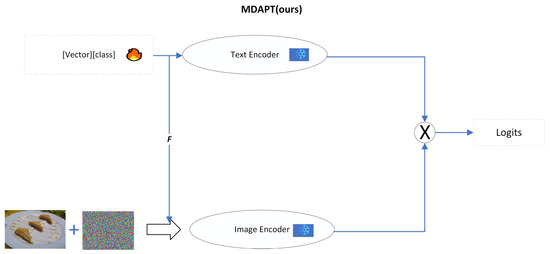 Our motivation derives from the multi-modal nature of CLIP [1], where a text and image encoder co-exist and both contribute towards properly aligning the vision–language modalities. A single mode can not achieve better semantic alignment, and text prompts alone cannot improve the effectiveness of the adaptive requirements of image encoders. As far as the main working methods are concerned, APT [19] uses only textual prompts, AVP [17] uses visual prompts, and PEAF [14] discards language branching, only fine-tuning the final linear layer. Although existing methods have certain advantages, they have obvious limitations when dealing with adversarial prompt tuning in VLMs. This is because a single modality does not better tune the visual language features nor more effectively enhance image feature embedding in the clustering. Therefore, employing a multi-modal approach is crucial for enhancing the robustness of VLMs. Our work aims to improve the adversarial robustness of pre-trained models by investigating textual prompts for guided visual prompt generation through multi-modal ideas. In order to improve the adversarial robustness of pre-trained models, a new Multi-modal Depth Adversarial Prompt Tuning (MDAPT) method, as shown in Figure 2, is proposed. MDAPT achieves stronger semantic alignment by jointly training textual and visual prompts to ensure effective adversarial prompt tuning. This allows text and image features to complement each other, thus enhancing the robustness of the overall model. In this paper, we use CLIP [1], a typical visual language model, because it has been widely used and developed.