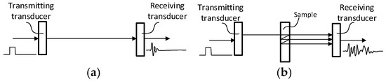 The air-coupled NC-RUS approach is described in [12,13,29]. Two transducers mounted at a known distance D are configured with one as the transmitter and the other as the receiver. The transmission response requires two measurements: (i) a calibration measurement, when the path between the transducers is free from obstacles, and (ii) a sample measurement, with the sample inserted between the transducers (Figure 1).