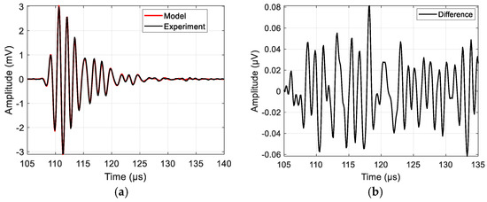 NC-RUS fitting result for sample signal when pulse excitation is used: (a) model and measurement signal comparison; (b) difference between signals obtained via subtraction of model signal from experimental one.