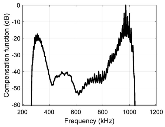 The compensation function ξ was derived from the SNR by using an additional window W, which aims to suppress the noise at the edges of the transducer passband (for f0 = 650 kHz, an attainable bandwidth is between 340 kHz and 940 kHz).