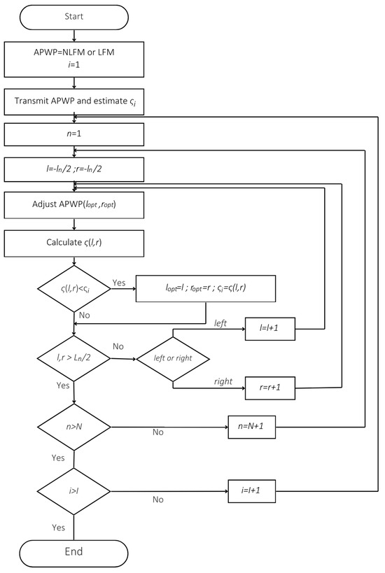 The algorithm begins with initializing the APWP signal using either NLFM or LFM, with the iteration index set to 1. The process involves transmitting the APWP signal and estimating a performance metric, ςi. Variables n, l and r are initialized, and adjustments are made to evaluate the function ς(l,r). If the function shows improvement over ςi, the optimal parameters lopt and ropt are updated. Iterative loops ensure that the algorithm explores all possible configurations within predefined limits. As soon as the maximum number of iterations is reached, the process terminates. Usually, 3–5 iterations are sufficient.