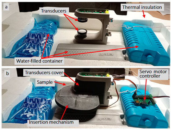 The aim of this study was to estimate the sample parameters using NC-RUS. The actual parameters of interest were the attenuation (α), thickness (h), ultrasound velocity (c) and density (ρ) of the sample. Atmospheric pressure, temperature and humidity significantly influence the ultrasound velocity in air [12]. The sample was placed in a thermally insulated chamber with water-filled containers (Figure 9) to reduce the temperature variation.