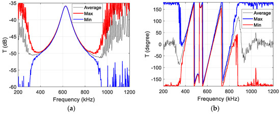 An example of the resulting transmission response of the polycarbonate sample is presented in Figure 10. The mean, minimum and maximum values are shown to give an impression of where the main variation, caused by noise, occurs.
