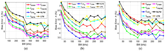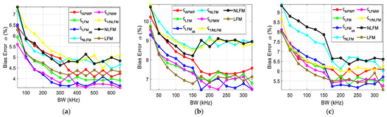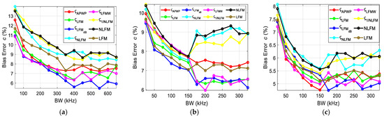 A total of eight signals were used—LFM, NLFM and six APWP signals—optimized according to (13)–(18). Each signal combination produced 100 results for each step of bandwidth variation; three bandwidth placements were evaluated. The results were processed to obtain the mean and then compared against caliper measurements to obtain the bias error.