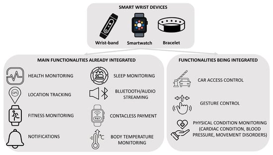 A smart wrist device and a smartphone are different in several important ways. First, a smartphone is a portable device, while a wrist device is a wearable that is worn on the wrist. Compared to smartphones, smart wrist devices are physically smaller overall and have a considerably smaller display. Also, the main goal of smart wrist devices is to give users rapid access to features such as monitoring fitness and health data, managing smart home appliances, receiving alerts, etc. Smartphones can do more than just browse the web. They can play media, browse mobile apps, and perform more complex computing tasks. Regarding the input method, a smart wrist device usually lacks the complete touchscreen and virtual keyboard seen on most smartphones, instead relying more on voice commands, touch gestures, and physical buttons for input. Both devices connect to the internet and sync with other devices. However, smart wrist devices often rely more on Bluetooth pairing with a smartphone to access internet connectivity and cloud services. Finally, in terms of use cases, a smart wrist device tends to be better suited for quick interactions, fitness/health tracking, and remote control of smart home/IoT devices. In contrast, smartphones are more versatile for general-purpose computing, communication, and entertainment. Some use cases and/or functionalities have already been integrated into wrist-worn wearable devices for some time, but with the advancement of both scientific and industrial research, manufacturers are gradually increasing the portfolio of available use cases. Figure 1 shows the functionalities already integrated and those in the process of being integrated into smart wrist devices.