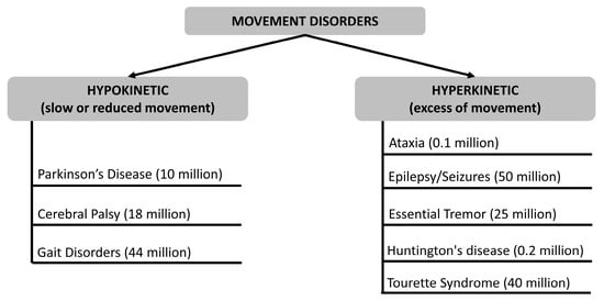 As evidenced by numerous publications, hypokinetic and hyperkinetic disorders are among the diverse range of neurological conditions known as movement disorders. Specifically, hypokinetic movement disorders are characterized by reduced movements, such as rigidity and akinesia/bradykinesia. In contrast, hyperkinetic movement disorders are characterized by excessive movements and include many motor manifestations. This sub-section aims to provide a brief clinical description of hypokinetic and hyperkinetic movement disorders (schematically shown in Figure 2) for which information can be provided through the use of wearable smart wrist sensors and for which there is at least one article downstream of the exclusion and inclusion criteria adopted in this review (see Section 2.3), i.e., ataxia, epilepsy, essential tremor, gait disorders, Parkinson’s disease (PD), Huntington’s disease (HD), seizure detection, cerebral palsy (CP), or unilateral CP (UCP), and Tourette syndrome.