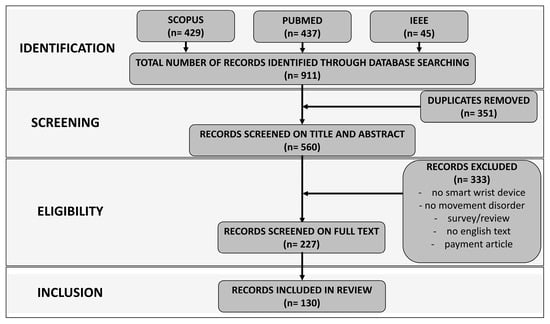 Following the definition of inclusion and exclusion criteria, 227 articles remained to be screened. A more in-depth reading was necessary for these articles. Specifically, the internal manuscript was analyzed to include those articles that in some way classified movement disorders using the raw data provided by the wrist device. In fact, through this in-depth process, articles were excluded in which data extracted from the smart wrist device was used but which did not provide information on movement, such as heart rate, oxygenation, number of steps, or sleep stages. Ultimately, the articles that met the inclusion criteria, and therefore, were considered for our proposed comprehensive study, were 130. The study selection process is depicted in Figure 3.