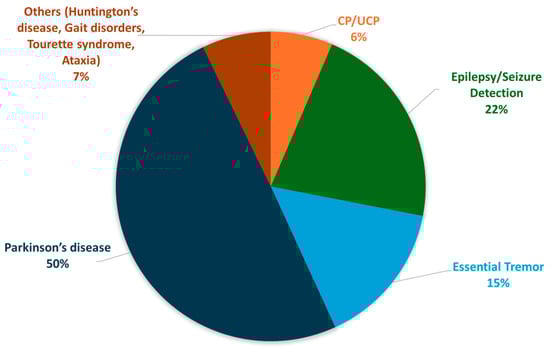 Most selected articles (sixty-eight of the one hundred thirty publications included in the review) addressed using smart wrist devices for PD. The topic of thirty publications was epilepsy/seizure detection with smart wrist devices. The essential tremor and the CP/UCP were the subjects of thirteen and eleven publications, respectively. The remaining nine publications cover a variety of movement disorders which, however, are less investigated by the scientific community, including gait disorders (four publications), HD (three publications), ataxia (one publication), and Tourette syndrome (one publication). Seven articles also describe the use of smart wrist devices concerning two movement disorders: PD and essential tremor. The distribution of publications by movement disorder is shown in Figure 5.