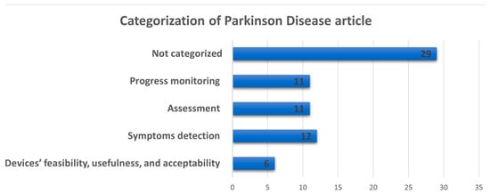 PD is the movement disorder most investigated in the last 10 years by the scientific community, using smart wrist devices. For this reason, this section includes many articles; consequently, it was deemed appropriate to divide them into thematic subsections, considering different aspects of diseases. The distribution of these articles is depicted in Figure 6.