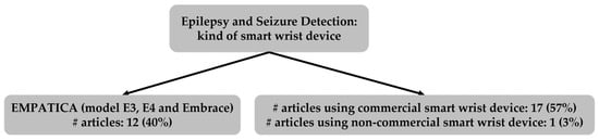 Wearable smart devices such as sEMG, EEG, or smart garments belong to the category of non-commercial smart devices and are generally used for scientific research purposes. Moreover, a disadvantage of these is that their use often requires the presence of qualified personnel. Commercial wearable devices, on the other hand, are usually designed and developed to be sold to the public and worn almost continuously. To this end, they usually use sensors embedded in everyday objects, such as smartphones, smartwatches, and smart rings. These devices are relatively inexpensive, widely available in the market, and often already available to the end-user. In addition, they require no specific knowledge to be used. The drawbacks of commercial devices include their lack of advanced software and analysis algorithms, their overall lack of validation, their intended use neither for research nor clinical practice, and, with few exceptions, their inability to obtain a medical license from regulatory bodies.