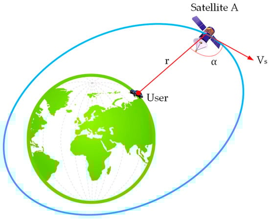 where , is the transmission frequency of the signal. From the above Equation (4), we can conclude that the magnitude of DS depends on the satellite signal frequency and relative motion velocity between satellite A and the user, and the positive or negative of DS depends on the direction of relative motion, which is determined by .
