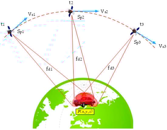 where denotes the three positions of satellite A; is the transmission frequency of the satellite signals; is the speed of light; the vector velocity of satellite A; is the spatial position of the satellite; is the position of the test point. The meanings of the other letters in Equation (5) are shown in Figure 2.