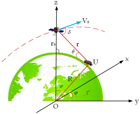 where is the gravitational constant, is the Earth radius, is the satellite vector velocity, is the position of the user, is the satellite orbital altitude, and the definitions of and are shown in Figure 3.