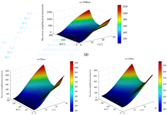 The error amplification factors of a single satellite at different satellite orbital altitudes. (a) The error amplification factors of a single satellite at the satellite orbital altitude of 340 km. (b) The error amplification factors of a single satellite at the satellite orbital altitude of 550 km. (c) The error amplification factors of a single satellite at the satellite orbital altitude of 1150 km.