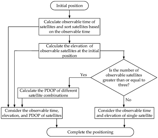 Figure 5 illustrates the satellite selection strategy derived from the above analysis, taking into account the effects of satellite observable time, elevation, and PDOP on positioning accuracy. Initially, the satellite observable time at the current location can be forecasted using two-line orbital element (TLE), and satellites are ranked according to their observation times. Next, based on Equations (13)–(16) presented in Section 4, the elevation of the observable satellites is calculated. Lastly, the satellite PDOP at the initial position is computed, and the optimal satellite combination is selected to facilitate positioning.