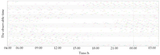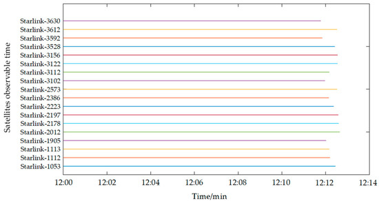 This study samples 200 satellites from the existing Starlink constellation and computes their velocity and positional data using publicly accessible Two-Line Element (TLE) sets. Figure 6 illustrates the ground tracks of these satellites. An observation site was established in Xi’an, China, to monitor the selected 200 satellites. The visibility durations are depicted in Figure 7. Figure 7 reveals that the observation site maintains continuous visibility of at least one satellite at any given time, suggesting the practicality of SOPs positioning utilizing Starlink satellite. Following the doppler shift positioning principle, the user’s location can be ascertained. We chose 12:00 p.m. as the observation time, and Figure 8 indicates that 18 satellites are visible at this time, with their visibility periods fulfilling the positioning criteria. Figure 7 merely displays the visibility times of the 200 satellites, yet the positioning approach outlined in this paper essentially satisfies the positioning needs at all times. It is conceivable that, once the full deployment of both Starlink and China Satellite Network’s constellations is complete, a greater number of satellites will be available for positioning purposes.